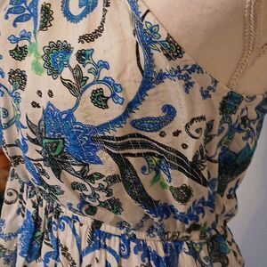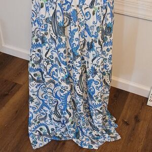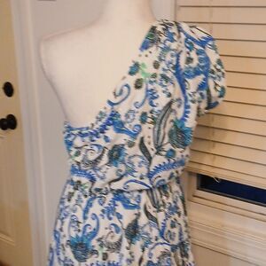 Elegant one-shoulder maxi dress featuring a beautiful blue and white pattern. Perfect for any occasion.