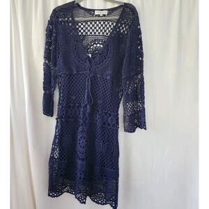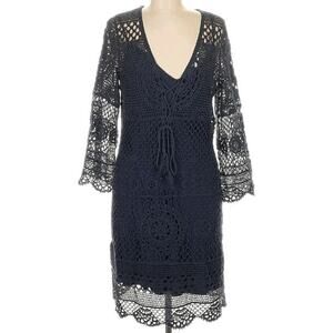 Hale BobKiki Crochet Dress M/ L Navy Blue Boho V-Neck Slip Lined Coastal Boho