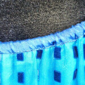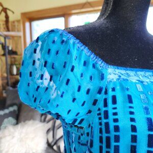 25523. This gorgeous Hale Bob Teal Velvet Burnout Beaded Tunic features a square neckline, cap sleeves with elastic empire waist, velvet designs with irridescent tube bead accents on semi-sheer shell. Fully lined. Could be worn off-shoulder as well! Material: 60% silk, 40% rayon; lining 100% silk