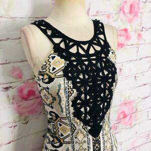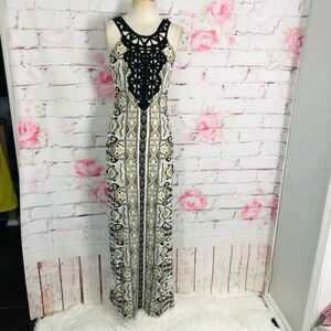 Fun flirty and feminine easy to wear sleeveless crochet neckline slinky stretchy lined maxi dress. Great for spring summer or a resort vacation. Travels well. Excellent used condition