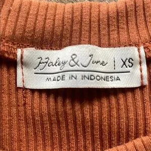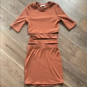 Chic rust ribbed two-piece set by Haley & June. Includes a crop top and skirt. Ideal for casual wear.
