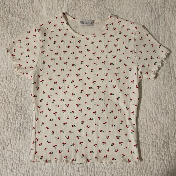 Haley & June White Cherry Ribbed Lettuce Edge Crop Top Shirt Size Small Baby Tee