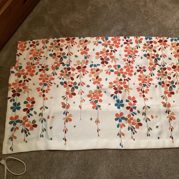 Polyester. 52”x18” +2”. Very good condition. Cream background with orange, peach, teal, burgundy, green flowers.