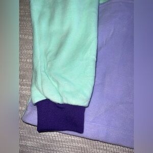 Cozy fleece pullover with a zip front. Features mint and purple colors. Includes a convenient front pocket.