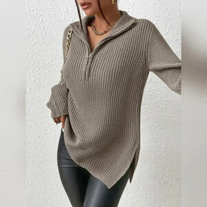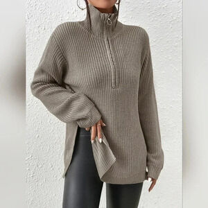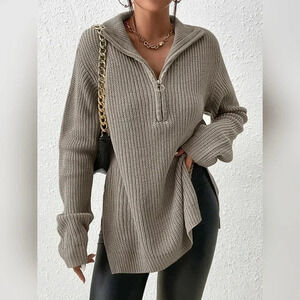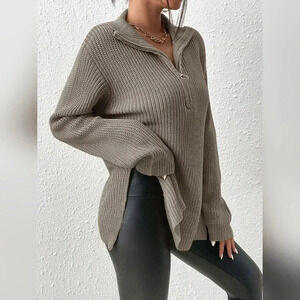 Half Zip Ribbed Knit Drop Shoulder Split Hem Grain Sweater