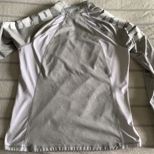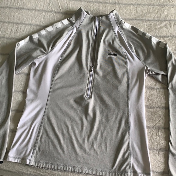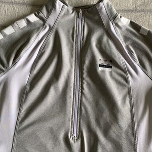Grey and white light weight half zip pull over jacket. This is a snug to body fit size Large in great condition. No stain or tears. Workout material great for wearing on a run.