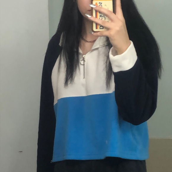 white dark blue & light blue half zip target brand (says xl but I’m a small and fits good :)