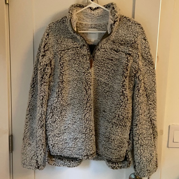 Thread & Supply half zip pullover. Incredibly soft and fluffy. Color is “olive” but looks mixed with white.