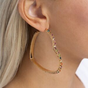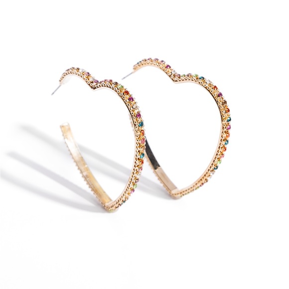 Set in gold lace-like fittings, a collection of multicolored rhinestones curl around a gold heart frame for a feminine display. Earring attaches to a standard post fitting. Hoop measures approximately 2 1/2" in diameter.