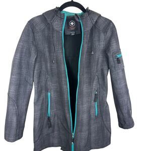 Excellent preowned condition. Gray softshell hooded full zip fleece lined rain coat/jacket. Blue trim along zippered areas. Zippered pockets on lower front side/left sleeve. Polyester/spandex material. Approx. measurements: Shoulder to hem 30", pit to pit 18", sleeve from neck to sleeve hem 28". Size S.