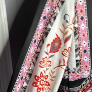 Black and pink print. Ruffle high neck and long balloon sleeves. Keyhole on the back with a button closure.