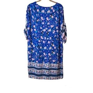 Women’s tie neck dress, shift style, short ruched sleeves, blue floral print, lightweight, side slits at hemline