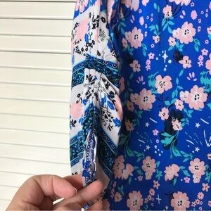 Halife Blue Floral Mixed Print Dress Size L Tie Neck Ruched Sleeve Lightweight