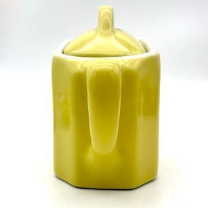 1940’s Hall Art Deco styled Individual Teapot/Coffeepot and Senegal Buttercup demitasse teacup and saucer. Please note these were not originally a set, and are by different manufacturers. The colors are almost identical, and the proportions are perfect. The teapot is octagonal shaped with a cute short spout. The cup is the shape of a buttercup sitting on a leaf, and the detail is amazing. Note the photo of the brown spot on the cup handle, which looks to be a defect in the firing process. Teapot 4” h, 6” w; cup 2” h, 2.25” w; saucer 5”