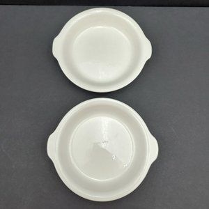 Hall 513 Round Au Gratin Dishes / Individual Bakers / Small Baking, Quiche, Pie Dishes - Set of 2. These heavy, sturdy dishes are in excellent pre-owned condition. 7" handle to handle, 6.5" across, 1.25" deep.
