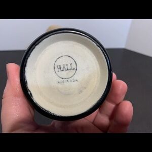 D E S C R I P T I O N: This is a vintage Hall China black shaving mug with a handle and a shaving brush. The black finish has a nice glossy look. Hall and made in the USA is stamped on the bottom. The handle of the shaving brush is plastic. I'm not sure what the bristles are made of.