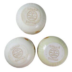 This trio of 7 oz custard dishes features the beloved Autumn Leaf pattern, produced by Hall China exclusively for the Jewel Tea Company from 1933 onward. The “Radiance” shape—distinguished by its scalloped rim and flared base—was manufactured between 1939 and 1976. Each dish measures approximately 2⅛" tall and 3½" wide.