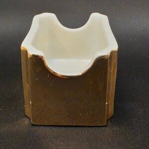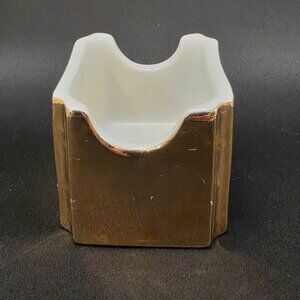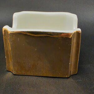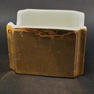 The Hall Golden Glo Sugar sweetener packet holder is a vintage 1950s ceramic piece with a luxurious 22K gold finish. This unique sugar holder features the iconic Golden Glo pattern. Made in the United States, this retired piece is perfect for adding a touch of retro style to any kitchen or dining table. Its glossy finish and easy-to-fill design make it a practical and stylish addition to any collection.