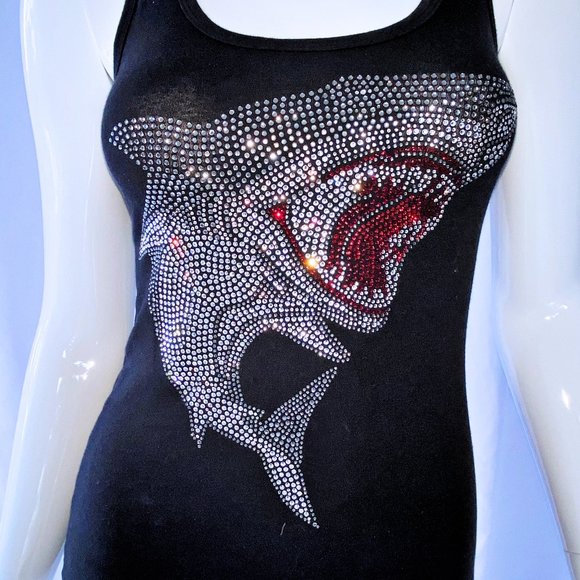 Are you a Maneater? Hall & Oates song "She's a Maneater" is given a graphic look with this rhinestone shark on the front. On the back in rhinestones it says "She's a Maneater" with credit given to Hall & Oates.