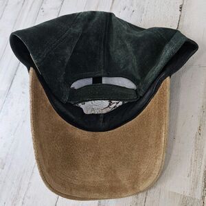 This vintage green and tan suede leather cap has a hook and latch closure. Embroidered New Zealand with kiwi birds on the front. Good pre-loved condition.