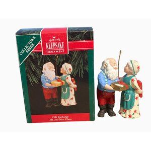 This collectible ornament from Hallmark's 1992 Keepsake series showcases a charming gift exchange between Mr. and Mrs. Claus. Its finely detailed design and festive colors make it a delightful addition to holiday decor. A thoughtful gift for collectors and Christmas enthusiasts, it brings nostalgic charm to any setting.