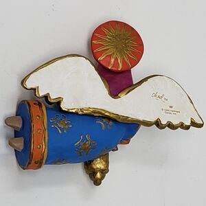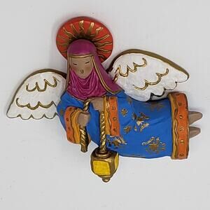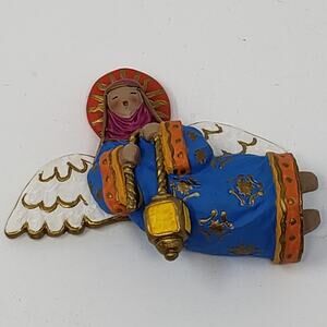 Hallmark 1996 Lighting The Way Ornament featuring a brightly colored angel carrying a lantern. On the back of the box, Luke 2:10 "I bring you good tidings of great joy" is written. This has never been displayed and was unboxed for photos.