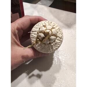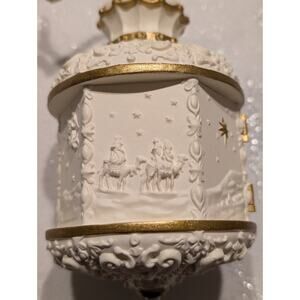 This beautiful Hallmark Keepsake Ornament from 1999, titled “Christmas Story,” is a finely sculpted Nativity collectible designed by artist Duane Unruh. The ornament features an elegant white matte finish with gold accents and detailed raised scenes of angels and the Three Wise Men surrounding the exterior.