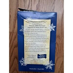 Brand new Celebration Barbie Ornament, fifth in the collectors series, special 2004 edition, inspired by the Holiday Barbie doll. Barbie is wearing an elegant emerald green gown. This ornament has never been used. Box is torn on top flap and has some dents that do not affect the ornament. The ornament in excellent original condition, never removed from its original cellophane wrapper.