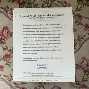 tags: Star Wars ornament, Hallmark Keepsake ornament, 2006 AT‑AT ornament, AT‑AT and Snowspeeder, collectible Star Wars, Hoth battle ornament, vintage 2006 ornament, battery‑operated ornament, magic sound ornament, limited edition ornament, Rebel Snowspeeder figure, Imperial Walker decoration, holiday Star Wars décor, fan collectible ornament, Hurlburt designer ornament, Star Wars Christmas, themed tree décor, die‑cast collectible, mint in box Hallmark, nostalgia Star Wars gift