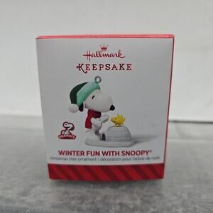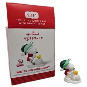 The Hallmark 2014 Winter Fun with Snoopy Series #17 Christmas Ornament features the beloved characters Snoopy and Woodstock with an igloo in a winter-themed design. This original Hallmark ornament from the Peanuts franchise is a part of the 2014 collection, perfect for fans of Snoopy and Woodstock. Made in Sri Lanka, this collectible item adds a festive touch to any holiday decor with its charming and nostalgic design.