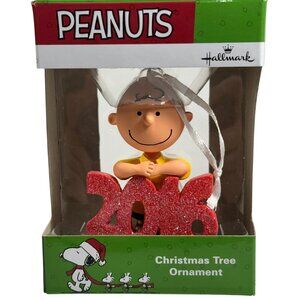 A collectible Hallmark Christmas ornament featuring Charlie Brown from Peanuts, designed with glittered red "2016" numbers, adding a festive and nostalgic touch.
