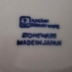 Vintage 1986 Hallmark "Auntie Em" stoneware cup & saucer set, made in Japan by Anchor Dinnerware. This charming pattern features a scalloped edge rim with a soft blue trim on ivory stoneware. Durable and versatile—safe for oven, microwave, and dishwasher.