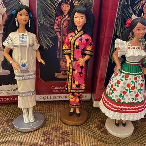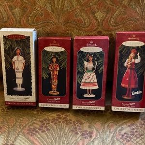 These Barbie ornaments were created by Hallmark 1996-1999. First in the series Native American Barbie; 2 Chinese Barbie; 3 Mexican Barbie; 4 Russian Barbie.