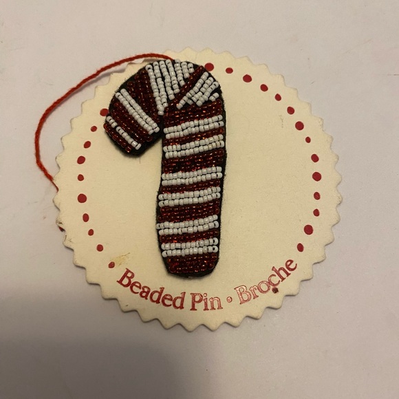 Festive candy cane brooch with red and white beads. Perfect for holiday outfits.