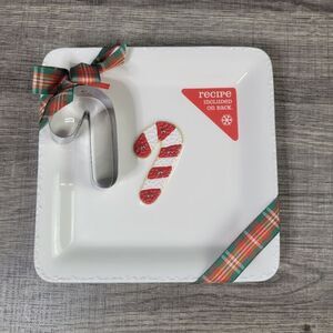 Adorable plate adorned with a festive candy cane on the front and a sugar cookie recipe on the back with a silver candy cane cookie cutter to create these delicious morsels! The perfect plate to leave cookies out for a beloved Christmas Eve visitor!
