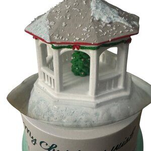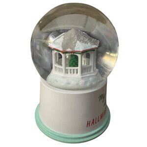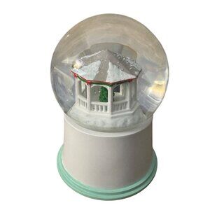 This snow globe showcases a charming holiday gazebo scene inside, complete with festive details and snowy accents, perfect for enhancing seasonal decor.