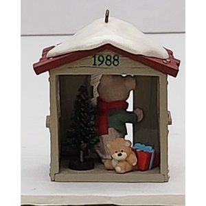 Plastic clubhouse building with bear opening door. Back is open to expose a Christmas tree, teddy bear, and gift. Dated 1988 on back side of building.