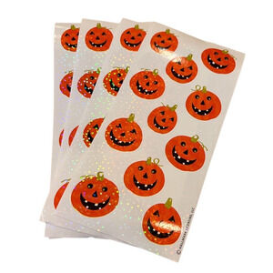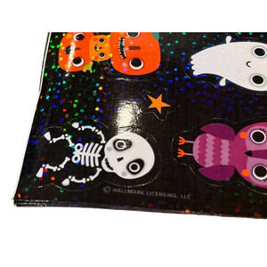 You'll get 8 sheets of new, unused Hallmark Halloween stickers. 4 pages of mummy, ghost, owl, pumpkin, skull, witches and bats and 4 pages of smiling pumpkins. They all have a glittery background. A great find!