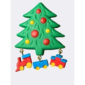 Admire this 2 inch tall Hallmark Christmas Tree Train Ornaments Charm Lapel Pin, which depicts a little train dangling beneath the Christmas tree. Marked © HMK. CDS. at the back. The pin functions properly and is in good vintage condition.