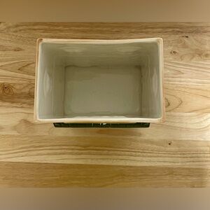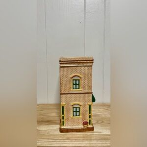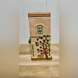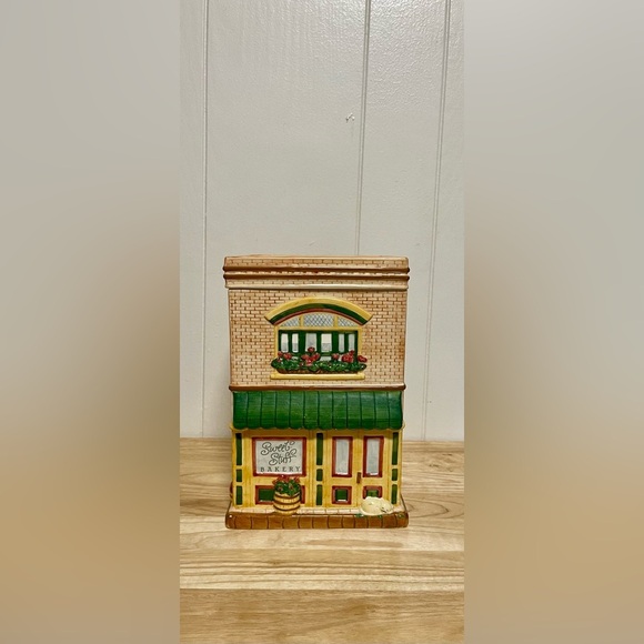 Vintage Hallmark, Jan Karon series, "Sweet Stuff Bakery" cookie jar. The jar measures 9" H, 6 1/2" W and 4" D. The bakery is a two story, flat roof building with windows, an awning and double front doors with a sleeping cat. The sides have windows, bushel baskets filled with apples and an apple tree. The back has a continuation of the tree, a back door with steps, a broom and a bicycle. This is a charming way to store your cookies, candy, tea bags or one of your favorite treats. This jar would look nice in any kitchen