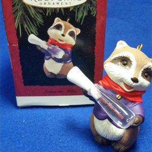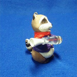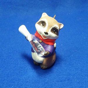 This adorable ornament features a raccoon holding a bottle with a message in it. On the outside of the bottle it reads "Across the Miles" and dated 94.