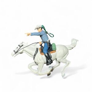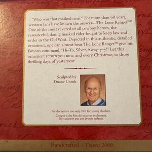 Add this classic western hero to your holiday display with the Hallmark Keepsake 2000 “The Lone Ranger” ornament. Sculpted by Duane Unruh, this detailed figure features The Lone Ranger riding his trusty horse Silver in full motion, complete with saddle, hat, mask and reins.