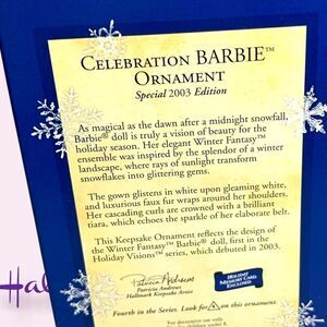 This Keepsake Ornament reflects the design of the Winter Fantasy Barbie doll, first in the Holiday Visions series which debuted in 2003.