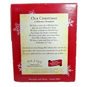 This 2005 Hallmark Keepsake "Our Christmas" Milestone Ornament, is a unique piece to celebrate wonderful memories. Constructed of durable plastic, it comes with a box for secure storage.