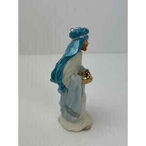 Porcelain Hallmark Keepsake ornament from 1999 featuring Balthasar, one of the three Magi, as part of the Blessed Nativity Collection by sculptor Joyce Lyle. Hand-painted with gold detailing and a blue and ivory color scheme. Includes original box with light wear.