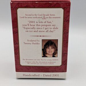 Hallmark Keepsake 2001 Cool Decade Penguin Ornament. Collector's series. Handcrafted. Sculpted by Tammy Haddix. Second in the Cool Decade series. "2001 is lots of fun," you'll hear this penguin say... "Especially since I get to slide on ice and snow all day!" Ornament is pre-owned in excellent condition. Box is showing wear due to age.