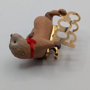 Hallmark Keepsake “Fabulous Decade” ornament from 1995, sixth in the series, featuring an otter laying on a brass “1995.” Pre-owned; ornament is in excellent condition, and the box shows wear from age and storage.