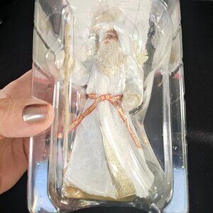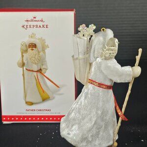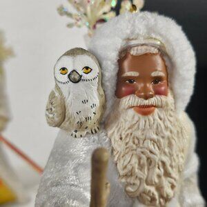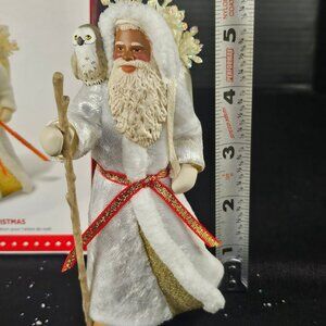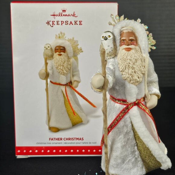 Celebrate the holiday season with this exquisite Hallmark Father Christmas ornament. This collectible is a part of the 12 series that features father Christmas in a white, velvety, fur edge rope and head covering with an owl perched on his shoulder, and a red and gold tie at the waist. There is a scrolling the bag on this back with a written message making it a unique addition to your collection. The message reads. The light of faith and the love of family kindle the heart of Christmas. A beautiful sentiment. Christmas is a time to let our family shine through the love we show one another. Material: Fabric and plastic. Artist Joanne Eschrich. Size 5.5 inches high. Item number QSM 7767. Conditions: Excellent., Figurine. The flap on inside a box has a small tear outside like new. A very lovely old time Father Christmas figure ornament. Non-smoking pet free home.