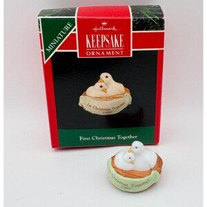The 1990 Hallmark Keepsake Miniature Ornament captures the nostalgia of a first Christmas together, featuring two charming doves nestled in a walnut shell. This piece evokes warmth and timeless romance, a sentimental addition to ornament collections.