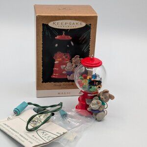Hallmark Keepsake Goody Gumballs! Light Magic Ornament from 1995 is a handcrafted design featuring two mice pals seeking a sweet treat from a gumball machine. This pre-owned ornament is in excellent condition, untested, with the box showing wear due to age and storage.